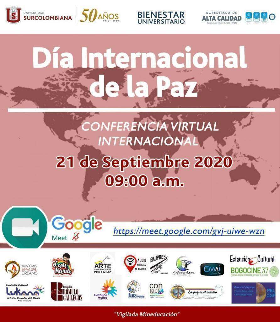 La Universidad Surcolombiana desarrollará el próximo lunes, 21 de septiembre, una conferencia virtual internacional con motivo del Día Mundial de la Paz 2020. El evento, que tendrá lugar a las 10.00 horas de Colombia, se lleva a cabo en homenaje a los artistas en condición de discapacidad y a las personas y fundaciones que trabajan "con ellos y por ellos".