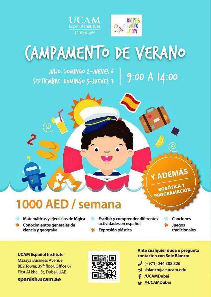 El campamento, que comenzará el domingo 3 de septiembre y finalizará el jueves 7, ofrecerá a niños de entre 4 y 11 años la posibilidad de disfrutar y aprender con actividades de matemáticas y ejercicios de lógica; conocimientos generales de ciencia y geografía; escribir y comprender diferentes actividades en español; expresión plástica y canciones; o juegos tradicionales y actividades de experimentación. Además, también se adentrarán en el campo de la robótica y de la programación. El horario es de 9.00 a 14.00 horas y el precio por la semana completa es de 1.000 AED.