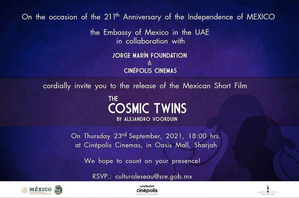 El Mes Patrio de México 2021 en Emiratos Árabes Unidos (EAU) está dejando su huella. Dentro de las numerosas actividades programadas por la Embajada de México se incluye el estreno del cortometraje 'Gemelos Cósmicos' (Cosmic Twins), producido por Jorge Marín y dirigido por Alejandro Voorduin.