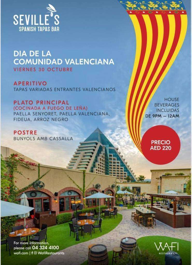 Los aplaudidos y siempre esperados encuentros gastronómicos del restaurante Seville's de Dubai, situado en Wafi Mall (ver localización), ya tienen fijada su próxima cita: el Día la Comunidad Valenciana. Tendrá lugar el viernes 30 de octubre de 21.00 a 24.00 horas y promete ser una jornada de alegre convivencia de la comunidad española radicada en Emiratos Árabes Unidos (EAU).