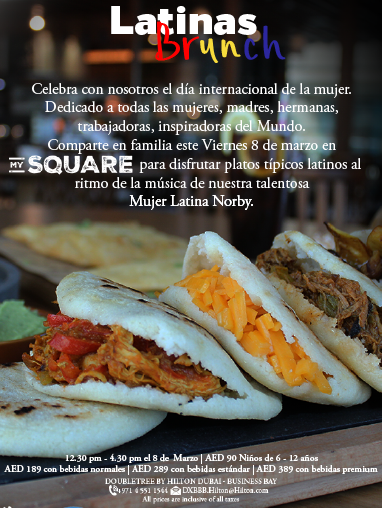 ¿Eres mujer? ¿Trabajas en casa o fuera? El restaurante My Square, ubicado en el hotel Doubletree by Hilton Business Bay, ha preparado un día muy especial llamado 'Latinas brunch' el próximo 8 de marzo para todas las mujeres, madres, hermanas, trabajadoras, inspiradoras del mundo. A partir de las 12.30 pm las asistentes podrán disfrutar de un día en familia con platos y música típica de Latinoamérica. La colombiana cantante Norby pondrá los mejores ritmos para que puedas desconectar de la semana. El precio del brunch será de 189 AED con bebidas normales; 289 AED con bebidas estándar y 389 AED con bebidas premium. Los niños de entre 6-12 años pagan 90 AED.