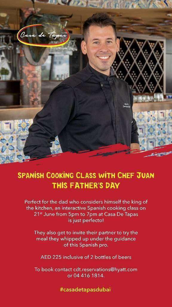 Casa de Tapas (ver localización) está multiplicando las actividades en la nueva etapa que acaba de iniciar para estar en permanente contacto con la comunidad hisnpanohablante residente en Dubai y Emiratos Árabes Unidos (EAU). Tras la exitosa presentación de su nuevo menú, la propuesta que ahora han organizado es una clase de cocina española con motivo del Día del Padre dirigida por el chef del conocido restaurante español, Juan Ramón Sobero.