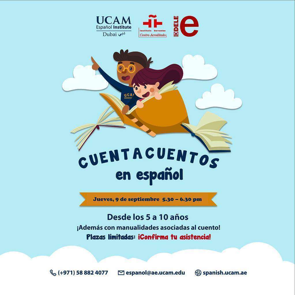Para comenzar este apasionante periodo lectivo, UCAM Dubai va a desarrollar un cuentacuentos gratuito en español para nativos de 5 a 10 años. Tendrá lugar en la sede del instituto (ver localización) el próximo 9 de septiembre de 17.30 a 18.30 horas. Puedes contactar confirmar asistencia a través del correo electrónico espanol@ae.ucam.edu o del teléfono 0588824077 tanto para llamada como para mensaje de What'sapp.