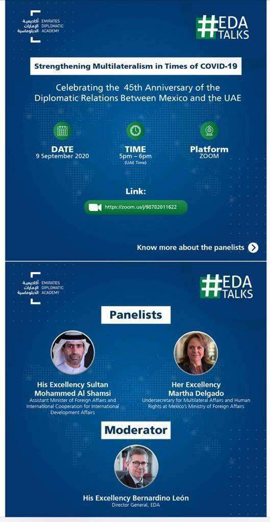 La cita, que será moderada por Bernardino León, director general de la Academia Diplomática de Emiratos, se llevará a cabo de 17.00 a 18.00 horas y se podrá seguir en directo a través del perfil de Facebook de la Embajada de México en Emiratos Árabes.