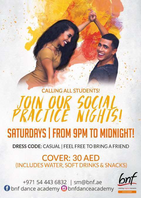¿Estás buscando en Dubai un espacio en el que puedas bailar Salsa, Bachata y Kizomba con los bailarines e instructores más prestigiosos del mundo? La renombrada academia de baile bnf dance academy (ver localización) ofrece eso y mucho más. Todos los sábados, a partir de las 21.00 horas, la academia abre sus puertas para que la conozcas y disfrutes de una experiencia llena de música y baile.