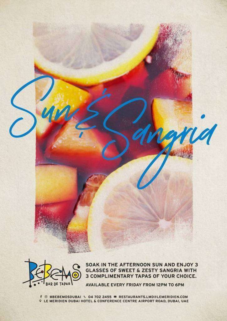 El restaurante español Bebemos (ver localización) ofrece en Dubai a todos los residentes hispanoparlantes en Emiratos Árabes Unidos una propuesta muy atractiva, 'Sol y sangría', gracias a la cual, quienes acudan los viernes de 12.00 a 18.00 horas al establecimiento de Le Meridien Dubai Hotel and Conference Centre, pueden saborear tres vasos de refrescante y deliciosa sangría acompañados de tres tapas complementarias a elección de cada uno. A ello hay que unir que Bebemos presenta actualmente otras grandes promociones como 'Pase español', 'Nos vemos en la playa de la Barceloneta' y 'La fiesta de la paella'. Todas muy auténticas y a excelentes precios, como corresponde a la única taberna barcelonesa que existe en el país.