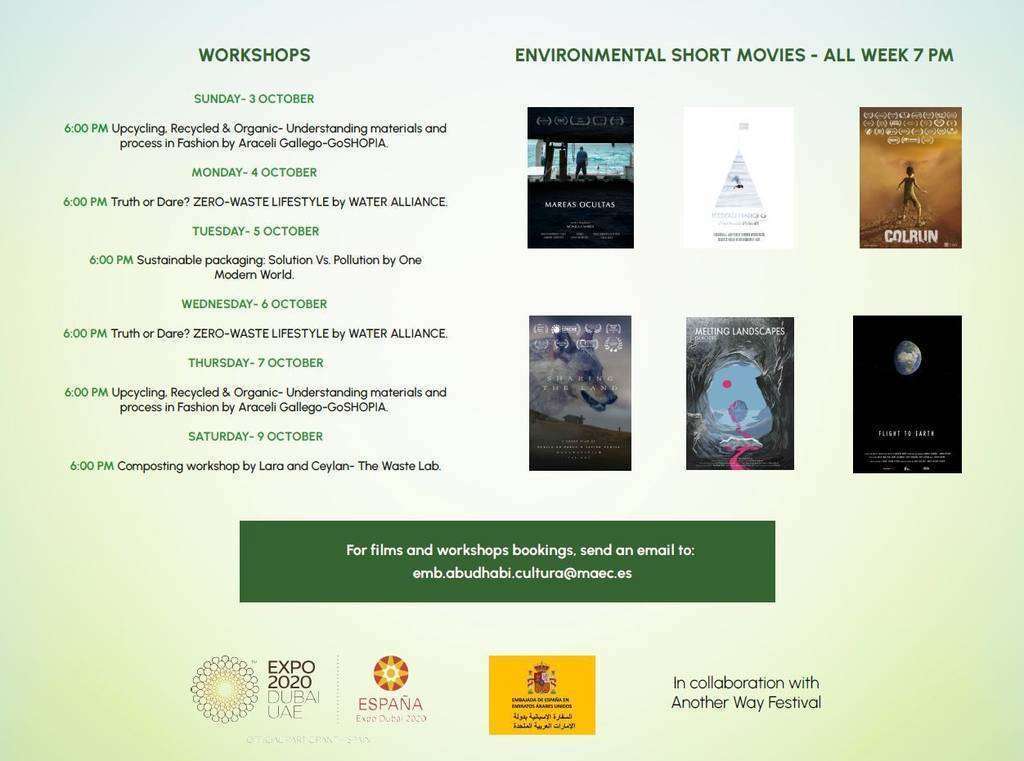Los talleres, que tendrán lugar a las 18.00 horas y serán impartidos por profesionales y empresas españolas radicadas en Emiratos Árabes pioneras en cada sector, enseñarán cómo reutilizar materiales de manera creativa, estilos de vida sin residuos, empaquetado sostenible y reciclaje para crear abono. Los cortometrajes, que darán comienzo a las 19.00 horas una vez finalizados los talleres, tratarán en inglés y en español temas relacionados con el medio ambiente, la contaminación marina, los desafíos derivados del cambio climático y las nuevas tecnologías.