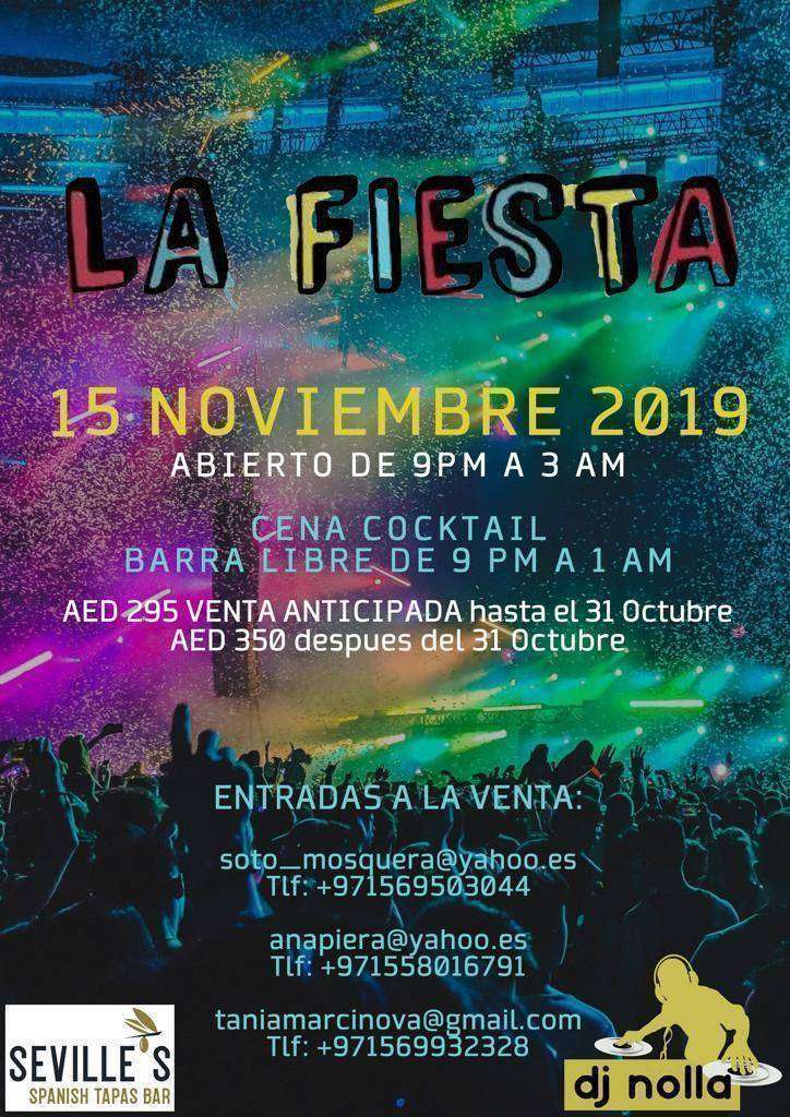 'La Fiesta' de Dubai vuelve por cuarto año consecutivo al restaurante Seville's de la mano de Diana Soto Mosquera, Ana Piera, Tania Marcinova y Vanesa Pérez Garvi el próximo 15 de noviembre con la promesa de mantener muy alto el listón de la fiesta española y ofrecer el mejor ambiente de todo el emirato.