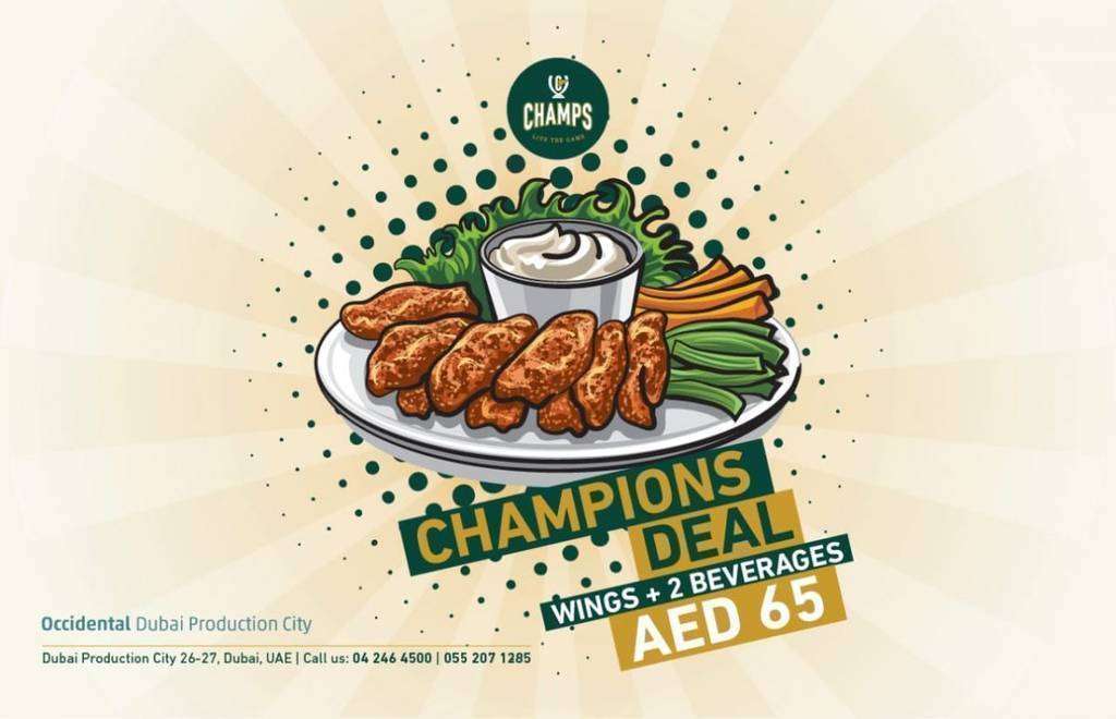 Y no hay que olvidar la promoción estrella de Champs Sport Bar: alitas de pollo + 2 pintas de cerveza por solo 65 AED. ¡¡Quién se puede resistir!!