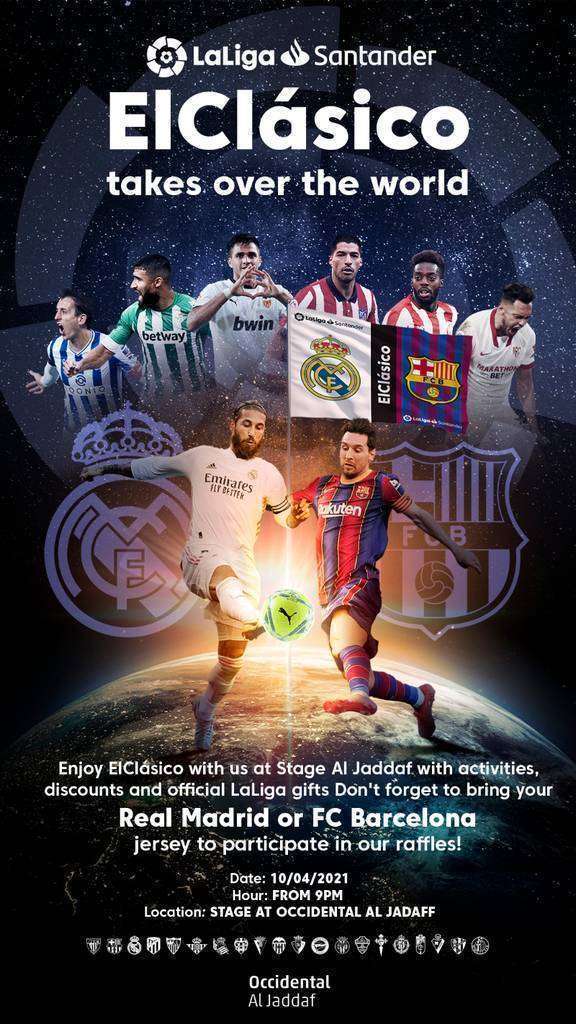 Estamos en puertas del apasionante Clásico. Real Madrid y Barcelona se medirán el próximo sábado 10 de abril en un partido protagonizado por grandes estrellas como Lionel Messi y Karim Benzema que paralizará el mundo entero. En Dubai ya está todo organizado para disfrutar del choque en la pantalla gigante de Stage en el hotel Occidental Al Jaddaf (ver localización).