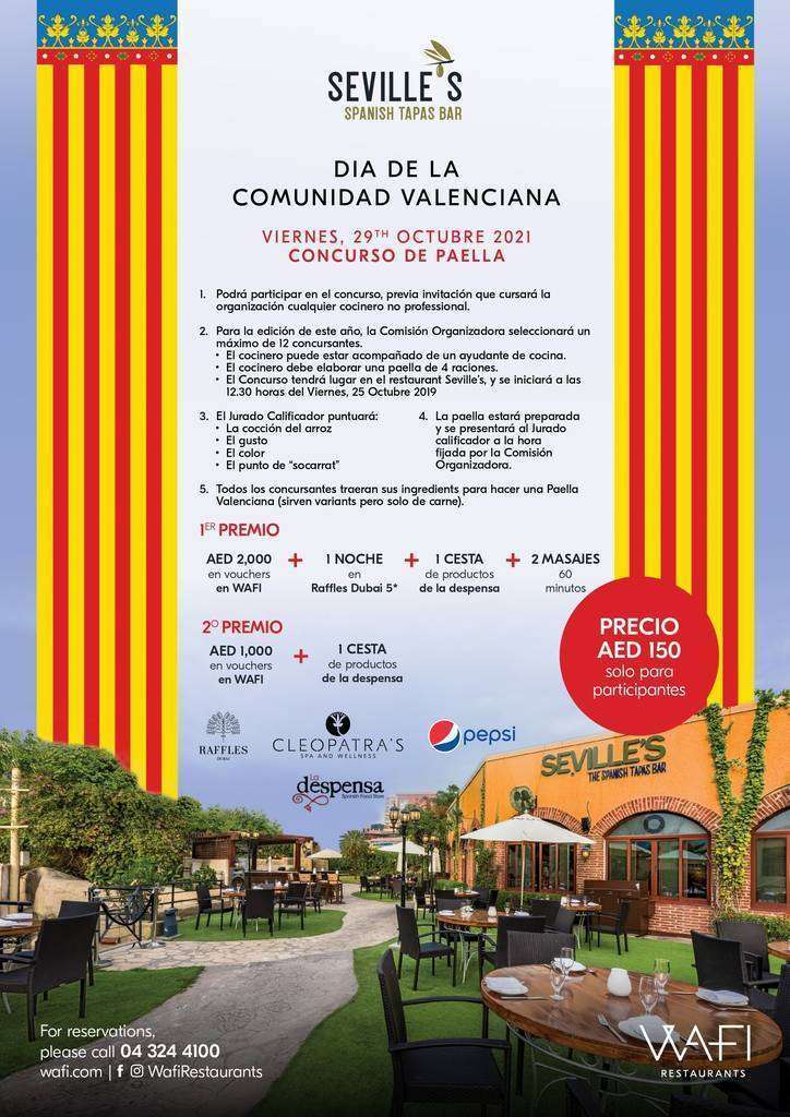 Vuelve a Dubai el esperado Concurso de Paellas del Seville's (ver localización) con motivo de la celebración del Día de la Comunidad Valenciana. Participa y gana grandes premios en reconocimiento a tus excelentes artes culinarias. Tendrá lugar el 29 de octubre en Dubai y será una gran jornada de convivencia de la comunidad española e hispana.