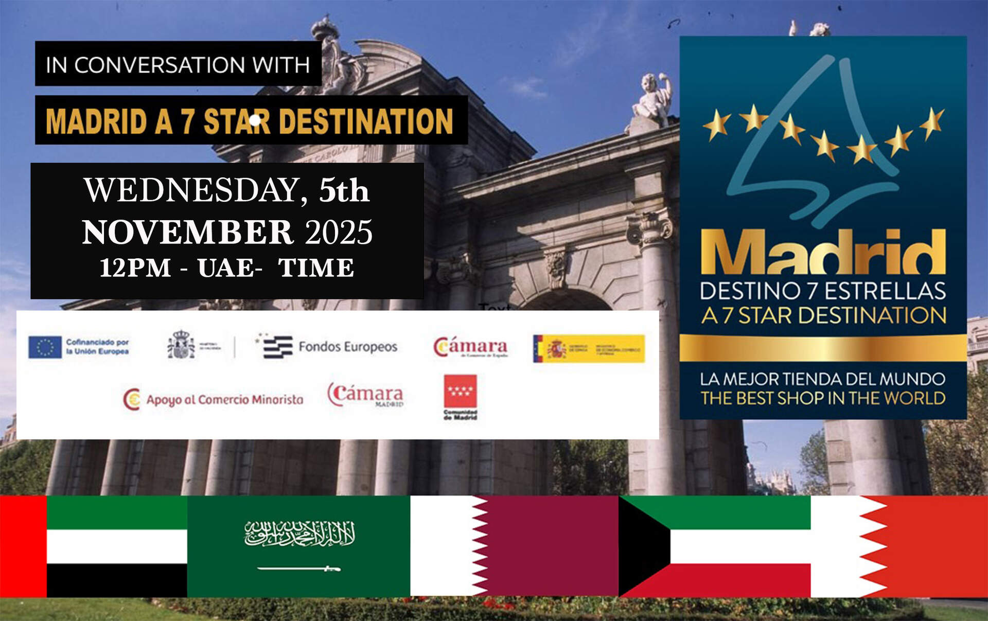 La consultora TANMIYA Business Partners, en colaboración con Middle East Experience y la Cámara de Comercio de Madrid, convocan a los profesionales del turismo de lujo del Golfo Arábigo a participar en la quinta edición del webinar 'Madrid 7 Estrellas: A Luxury Shopping Tourism Destination'. Este evento virtual, parte de una iniciativa oficial del Gobierno de España cofinanciada por la Unión Europea, se llevará a cabo el próximo 5 de noviembre a las 12:00 PM (hora EAU).