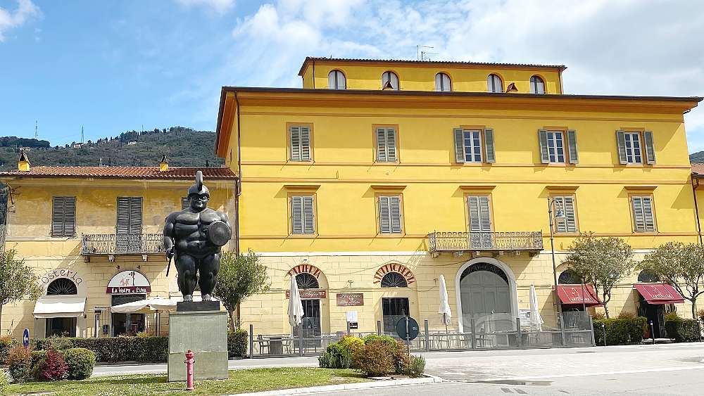 La huella de Botero, se encuentra en varios sitios. Sin duda, la más pública y evidente, la monumental escultura de El Guerrero, que saluda y despide a los visitantes que entran o salen en vehículo, pues está situada en la bifurcación de una avenida muy transitada, al frente de un edificio oficial de la comuna de Pietrasanta. Aparte de esta que es visita obligada, hay dos lugares que deseo recomendar de manera decidida.